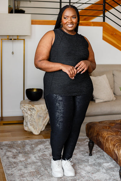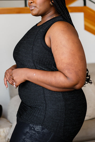Prepare for the best workout of your life in the Zone In Workout Top In Black! A stretchy, textured fabric shapes a round neckline with a sleeveless cut and rounded hem. Decorative seaming throughout.